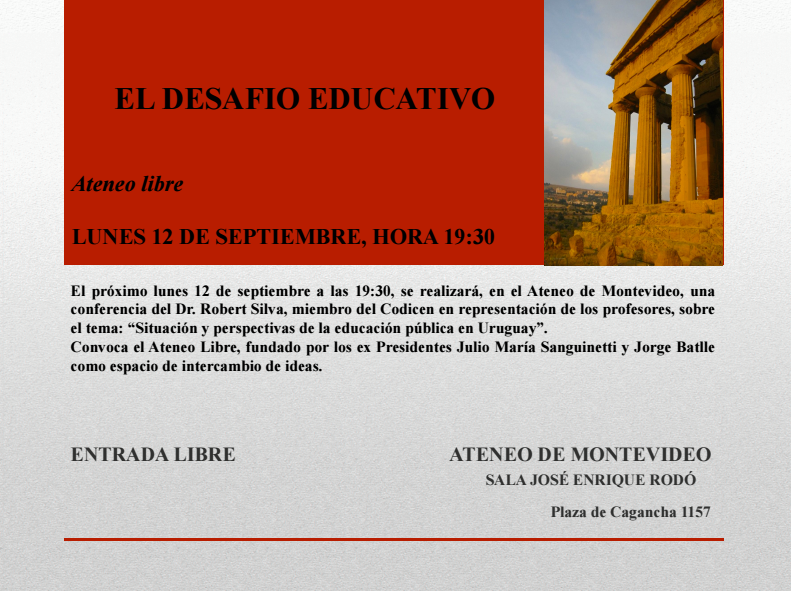 La conferencia será ofrecida por el Dr. Robert Silva, miembro del Codicen en representación de los profesores, y será sobre “Situación y perspectivas de la educación pública en Uruguay”.
