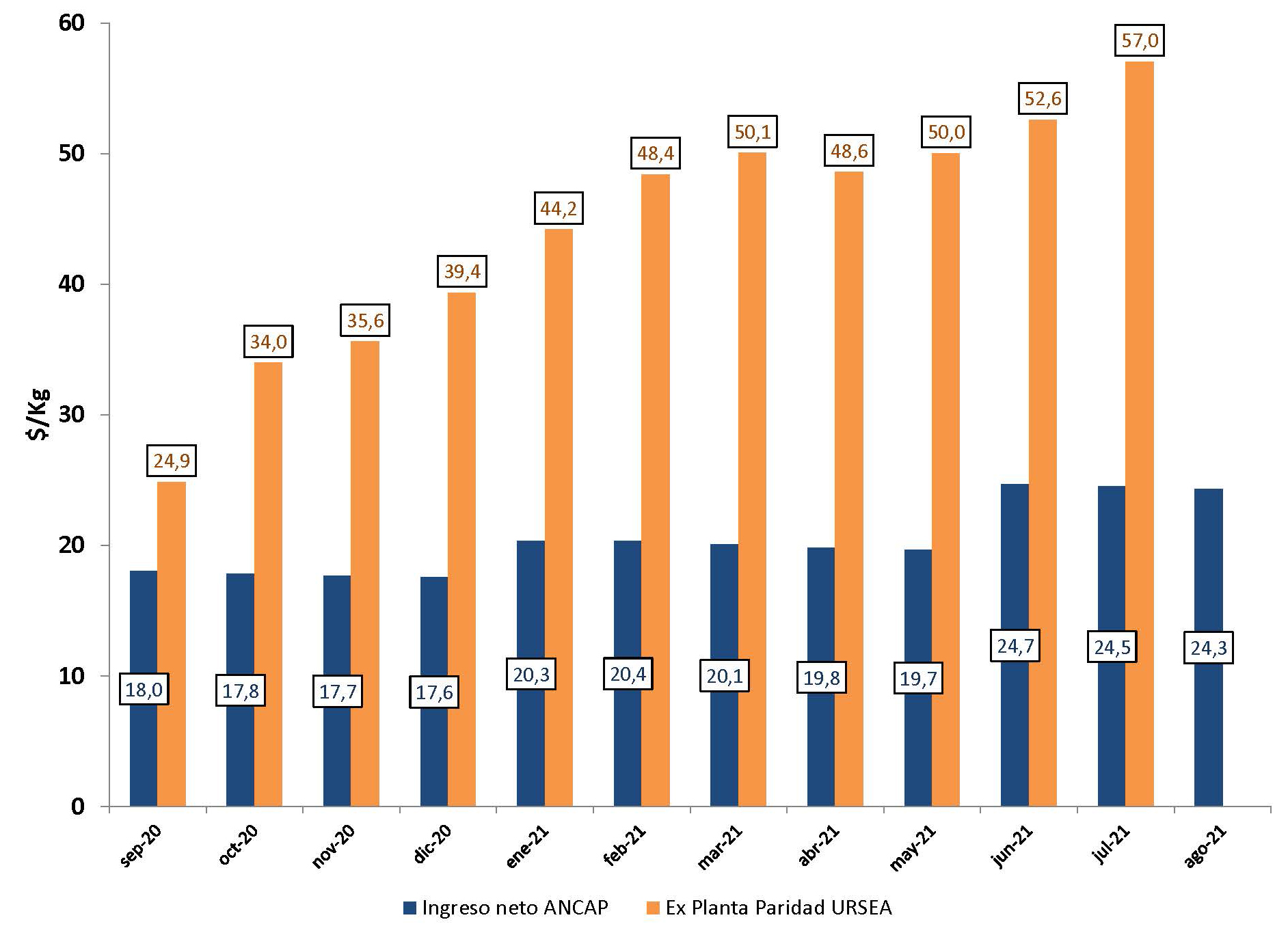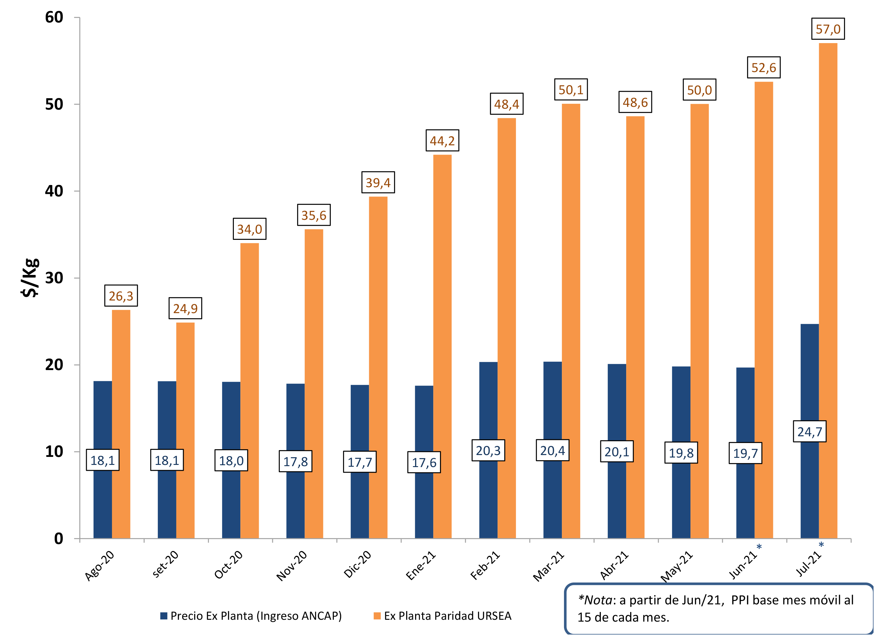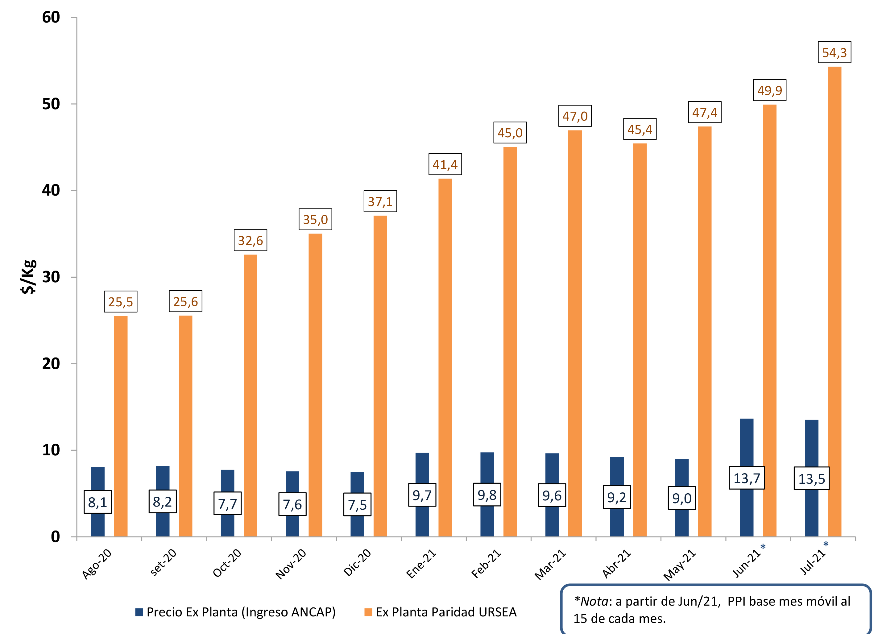 Desde el primero de julio de 2021, en función de los Informes preceptivos elevados por URSEA y por ANCAP, de acuerdo a los cambios introducidos en el mercado de combustibles según la Ley 19.889, el Poder Ejecutivo fija el precio en Planta ANCAP (PEP). El PEP sin impuestos es el ingreso neto que percibe ANCAP por sus ventas.