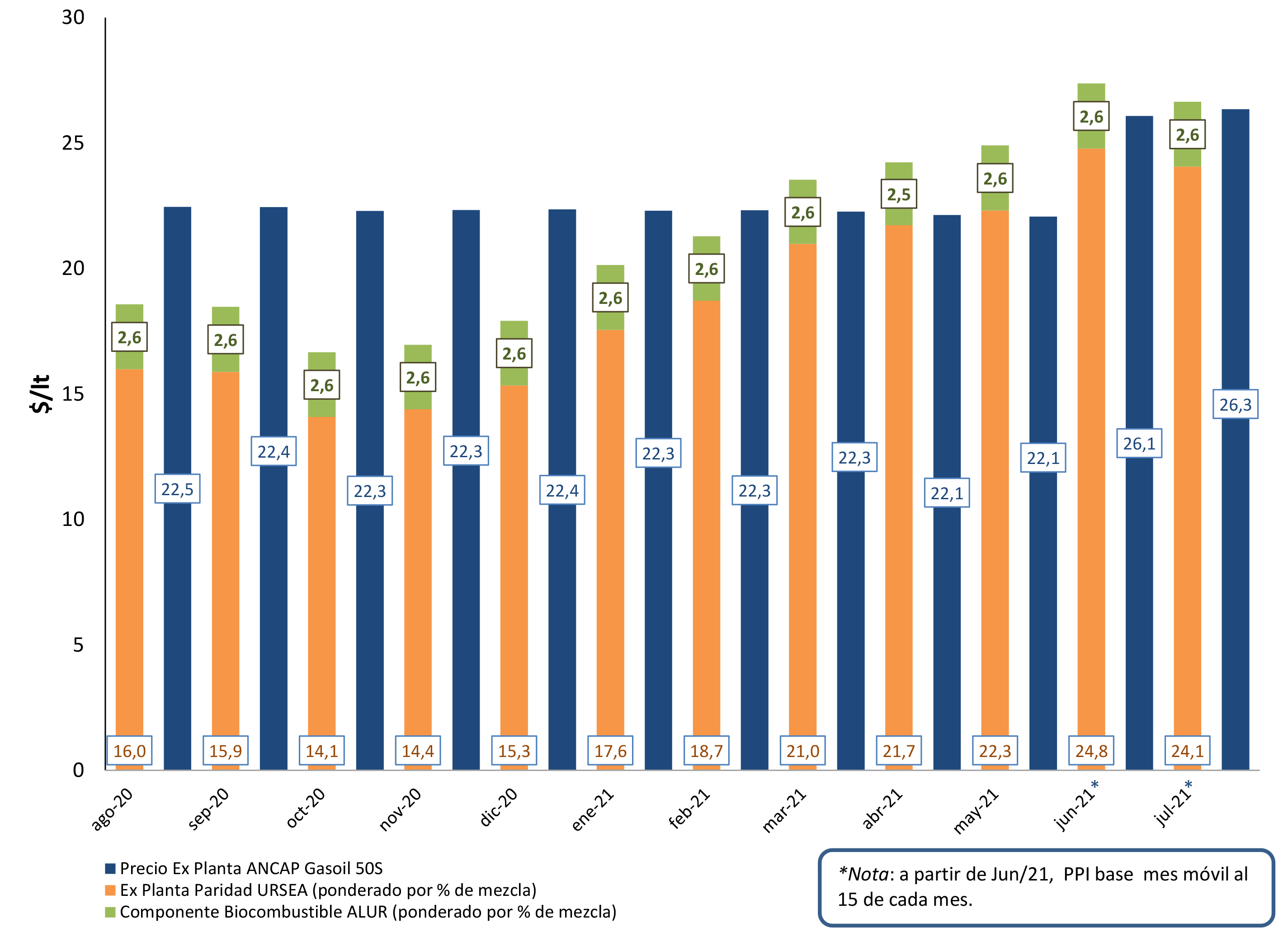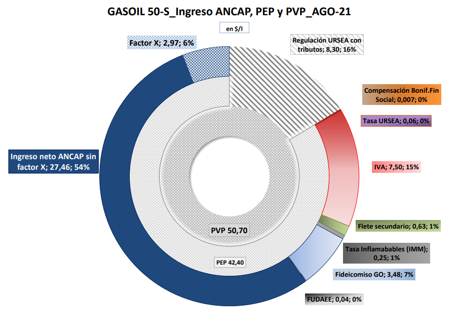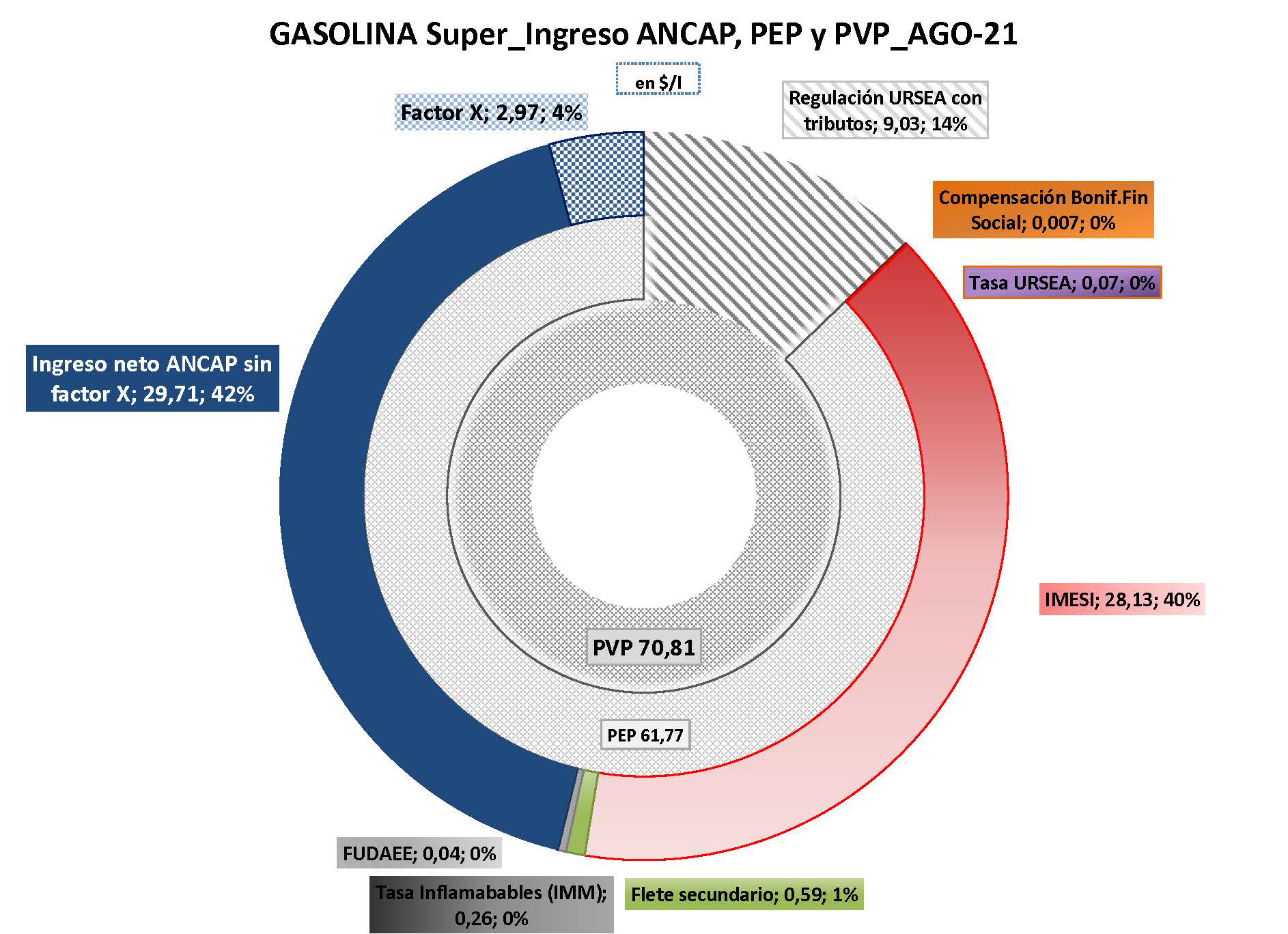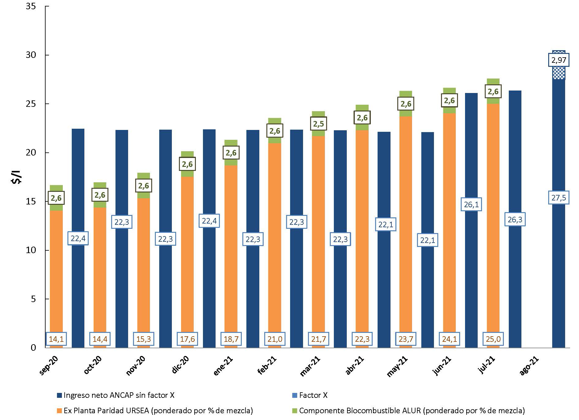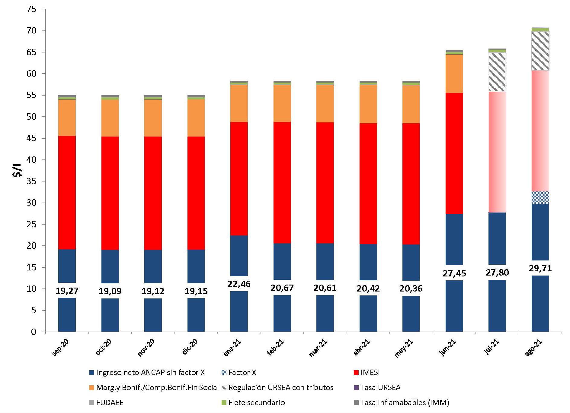 Nota: Desde agosto 2021 los precios de las Gasolinas y el Gasoil 50 S incorporan el factor X. Este factor mayoritariamente corresponde al subsidio del Supergás que surge como consecuencia de no fijar el precio de éste a la paridad de importación y venderlo por debajo de dicha referencia. También se incluye un adicional que reconoce el hecho de incorporar 10% de Bioetanol de origen nacional en la Gasolinas (5% por encima de lo reconocido por URSEA).