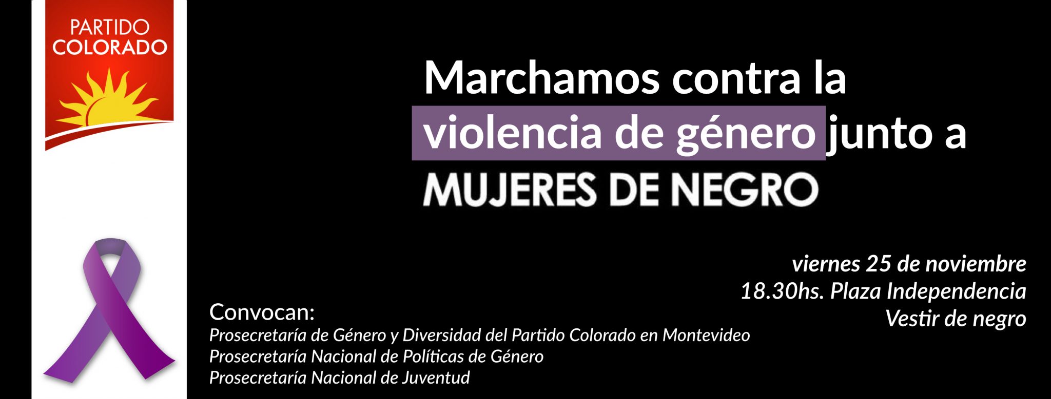 En el marco del 25 de noviembre, Día Internacional de la Eliminación contra todas las formas de Violencia hacia las Mujeres, estaremos marchando desde Plaza INDEPENDENCIA, Montevideo, junto al Colectivo Mujeres de Negro, Organizaciones sociales y referentes jóvenes de todos los Partidos Políticos con representación parlamentaria.Seguiremos levantando la bandera de la equidad en derechos, derechos humanos que debemos reivindicar y garantizar especialmente la no violencia en los más vulnerables, mujeres, niños/as, adolescentes y adultos mayores.