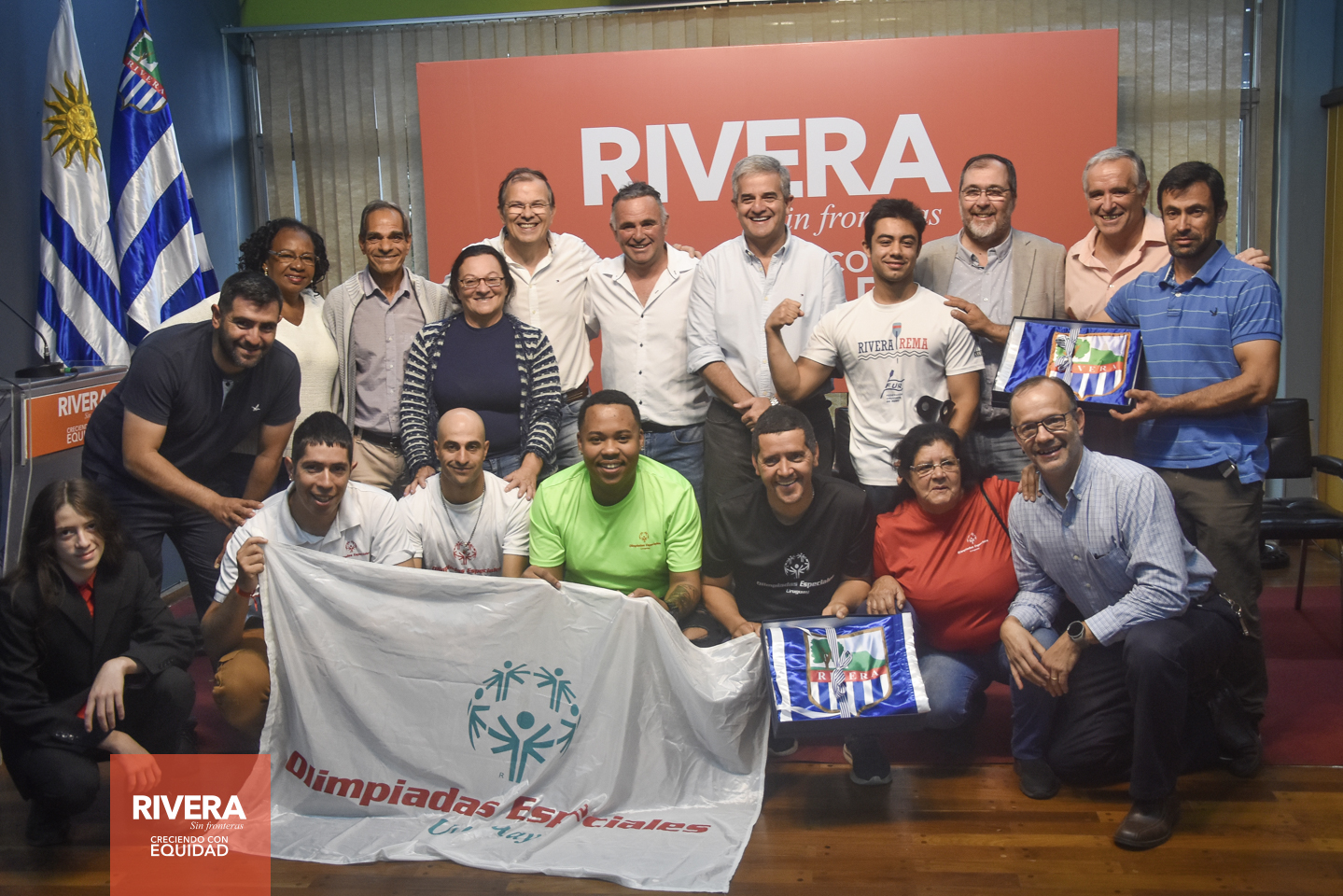 El Intendente Departamental de Rivera, Cr Richard Sander Darín, en horas de la mañana del viernes 9 de junio, en la sala de conferencias de la IDR, entregó banderas del departamento de Rivera a deportistas riverenses que representarán a Rivera y a Uruguay en el exterior.